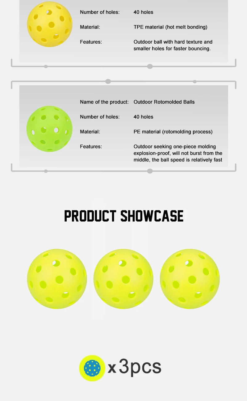 🔥1.Use environment: Choose the right pickleball according to the venue. Indoor and outdoor pickleballs have different designs, and outdoor balls are usually more durable and have better wind resistance.