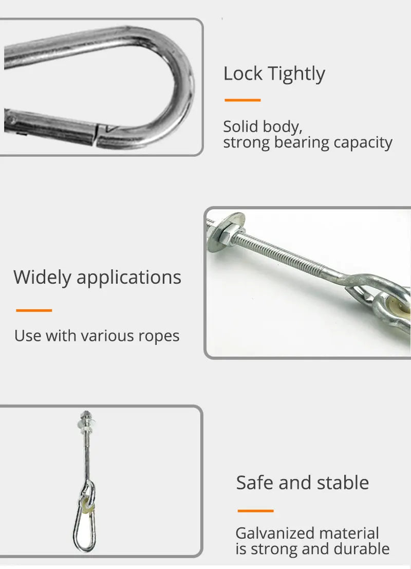 High quality metal materials, to hook your hammocks or swing chairs. All these materials have good corrosion resistance and toughness.