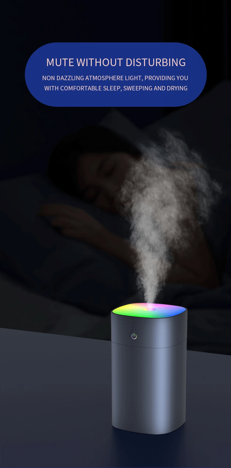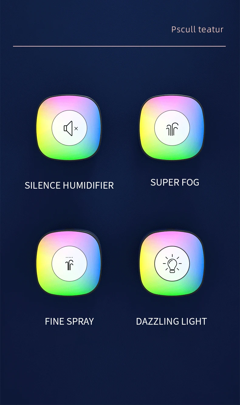 The dazzling light mode makes the humidifier more artistic, the slow seven-color light makes the mood soothing and relaxed, and the white light is suitable for use as a small night light.