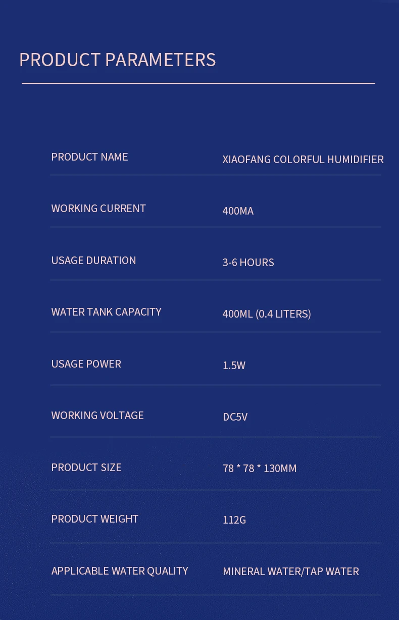 400ml capacity of the water tank, the maximum time of 6 hours of use, to meet the needs of various humidification.
