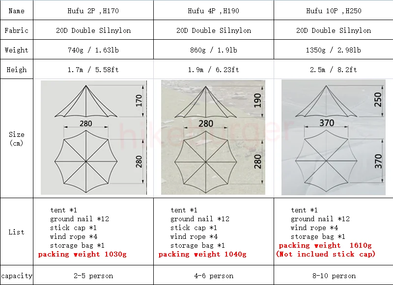 Notice: Hufu 2P(H170) \ Hufu 4P(H190) \ Hufu 10P(H250)are all not include inner tents.You can buy inner tents in my store.