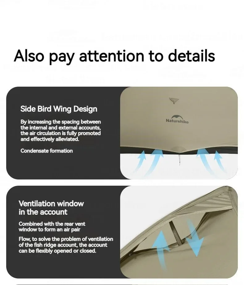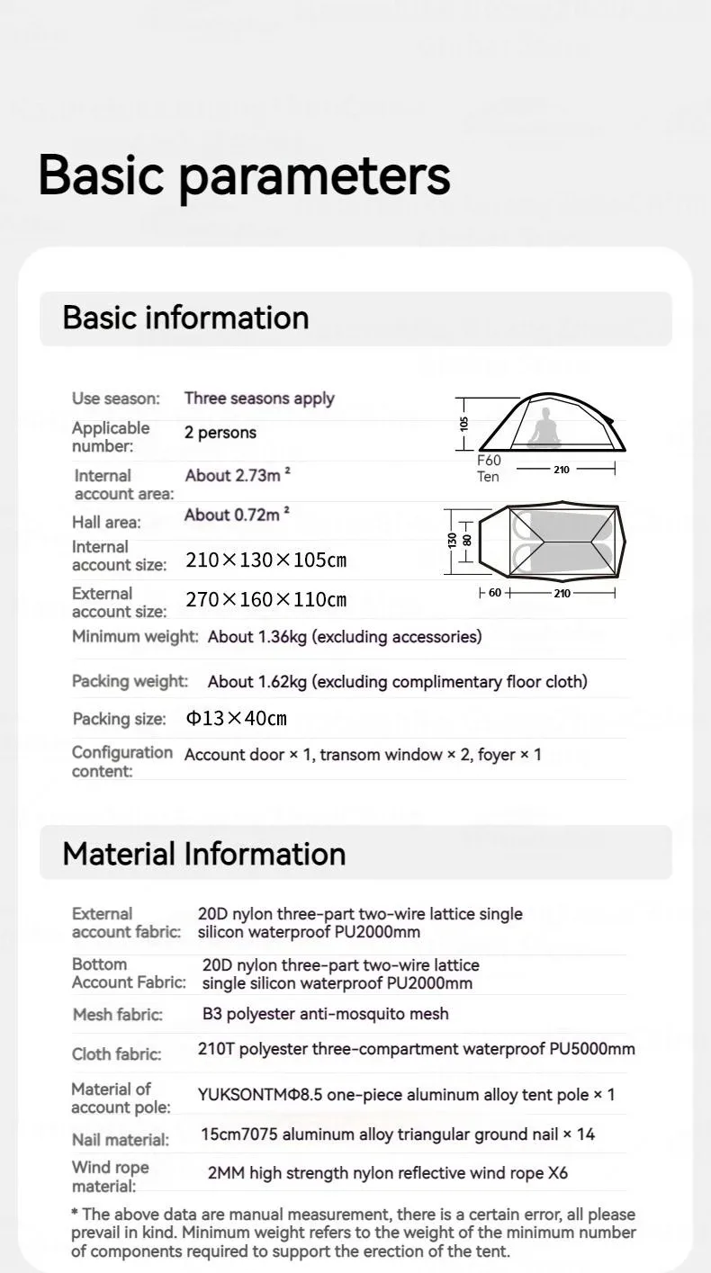 Inside tent size: 210x130x105cm/82.7x51.2x41.3 in