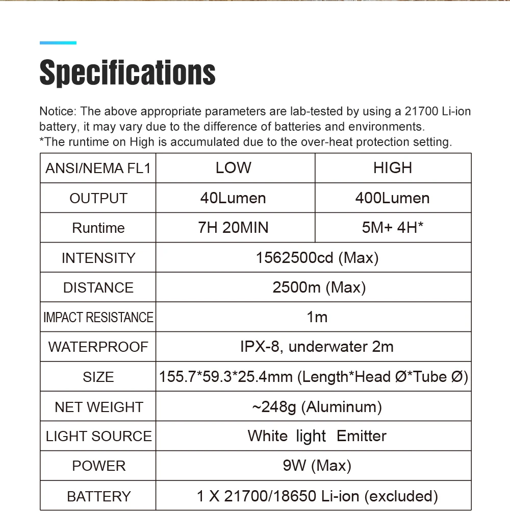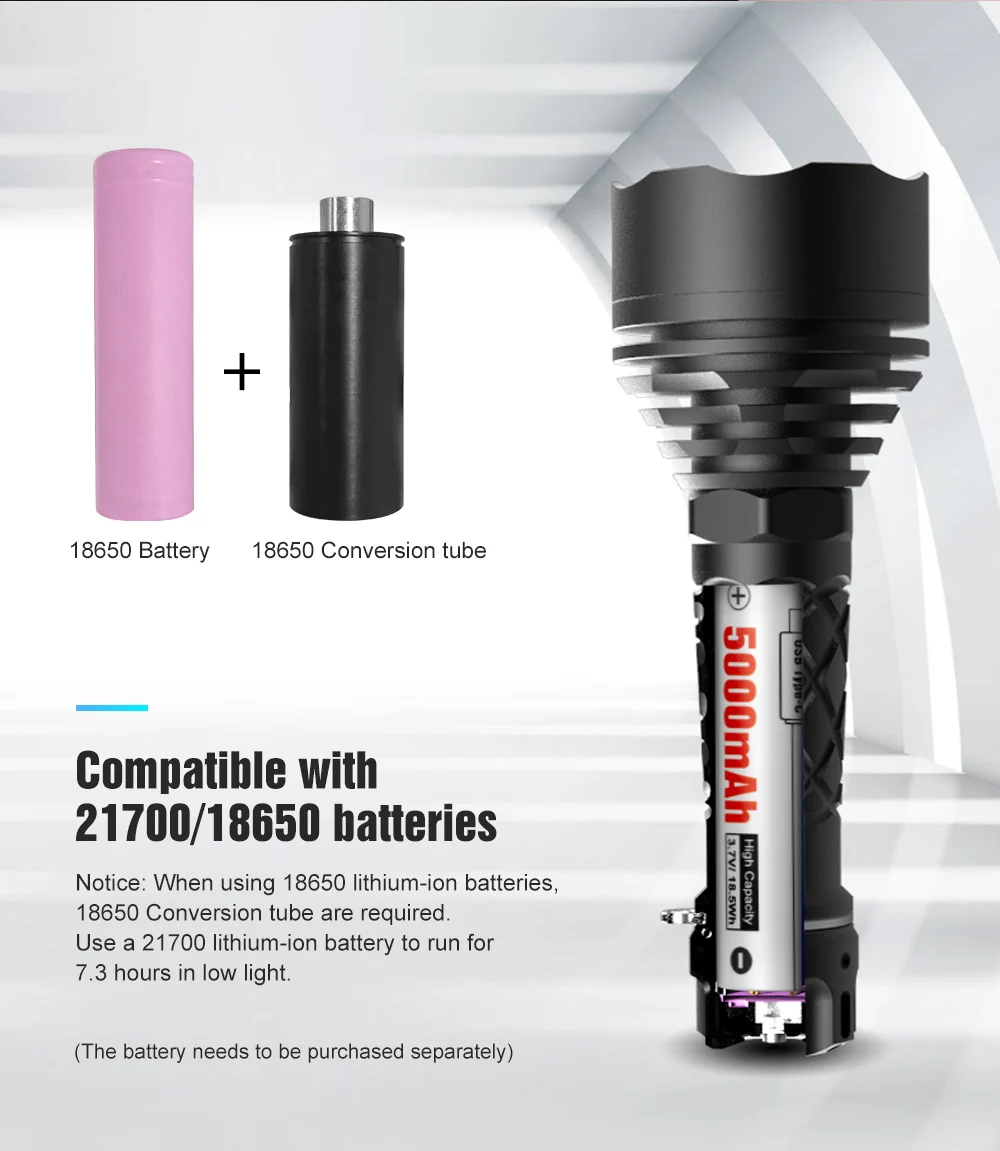 Battery: 1*21700/18650 Li-ion battery(excluded)