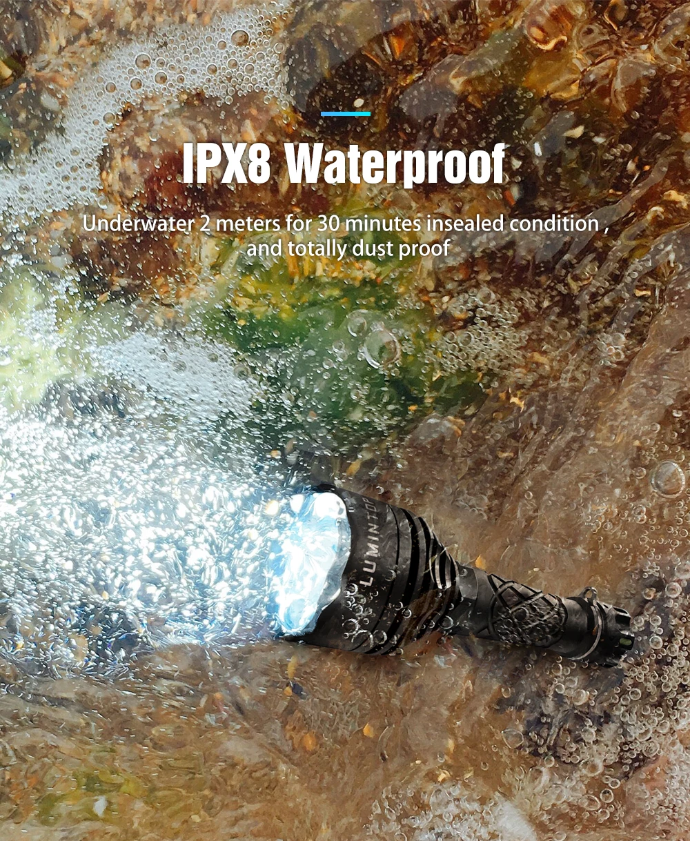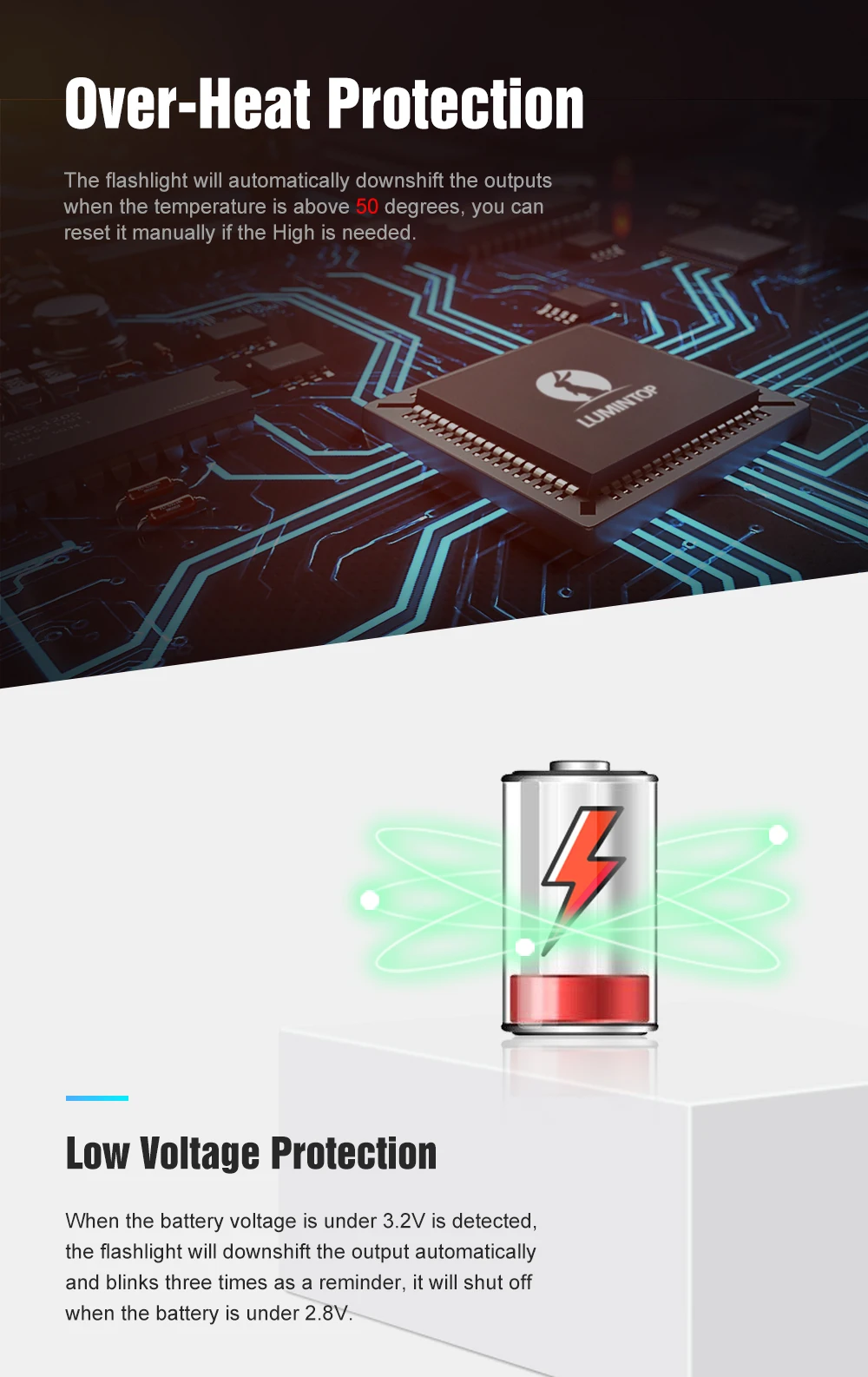 When the battery voltage is under 3.2Vis detected, the flashlight will downshift the output automatically and blinks three times as a reminder, it will shut off when the battery is under 2.8V.
