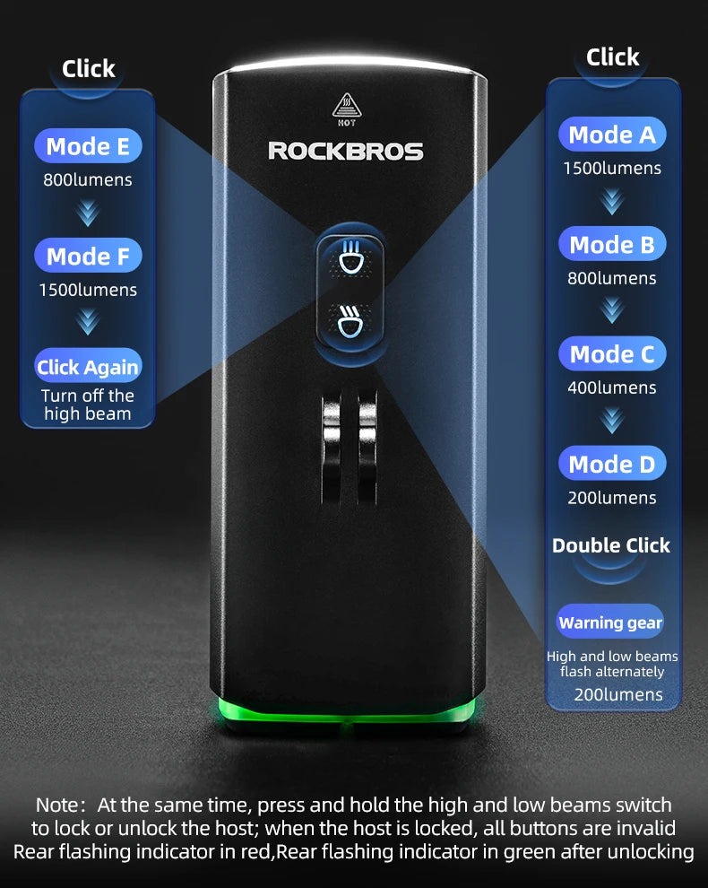 Press and hold the high beam button, turn on the low beam and high beam at the same time,and both the high and low beam modes are set at 1500 lumens