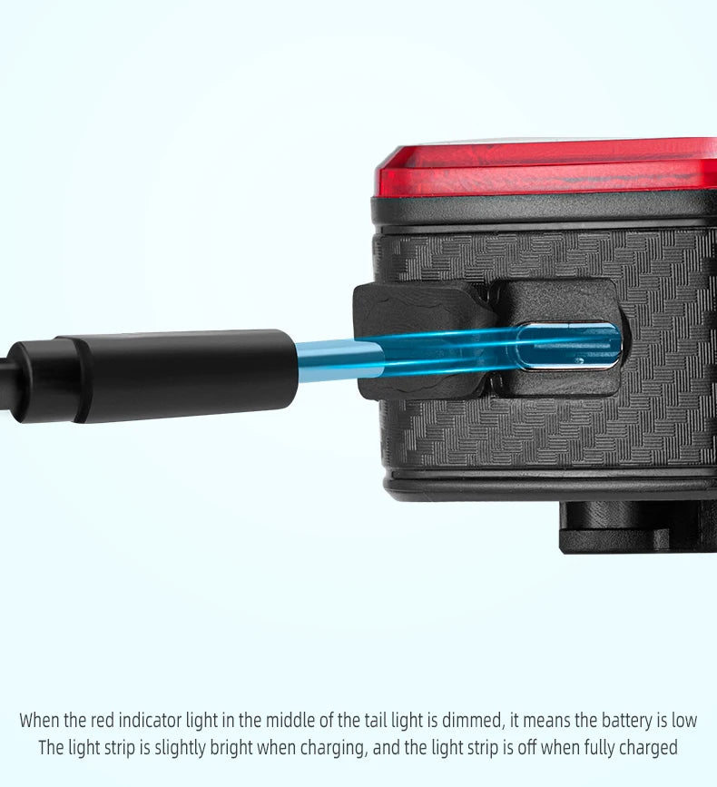 When the red indicator light in the middle of the taillight turns dark, it means the battery is low. When charging, the light strip will light up slightly, and when fully charged, the light strip will turn off.
