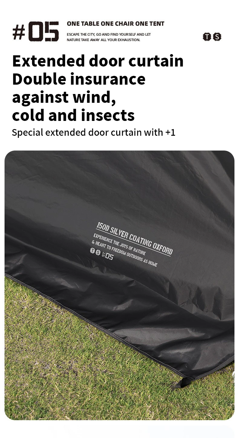 Not only does this tent offer superior sun protection, but it's also waterproof. With a compression PU3000mm design, you can rest assured knowing that you'll stay dry even in the heaviest rain. The elongated door curtains provide added privacy and protection, allowing you to fully enjoy your outdoor experience.