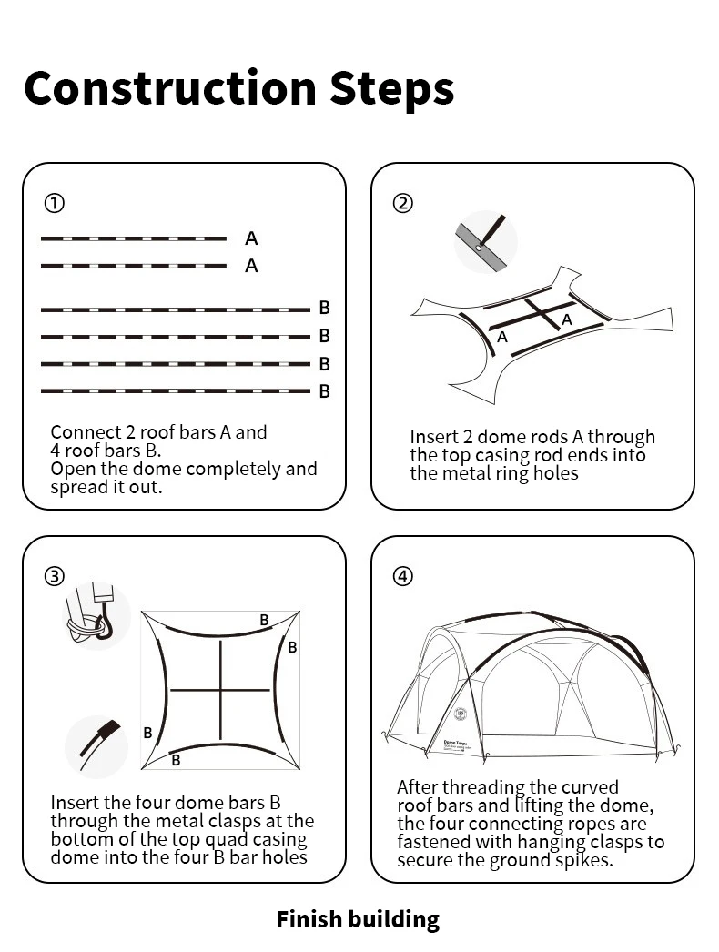 3.Set up is a breeze with the galvanised ground pegs and aluminium triangular wind rope buckles, allowing you to secure the tent firmly to the ground.