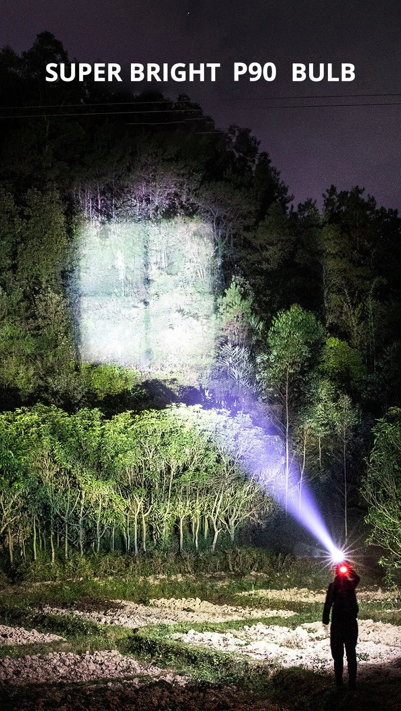 Super Bright LED Headlamp with XHP90 Lamp Beads Waterproof Headlight Power Display Suitable Exploration Hunting Fishing