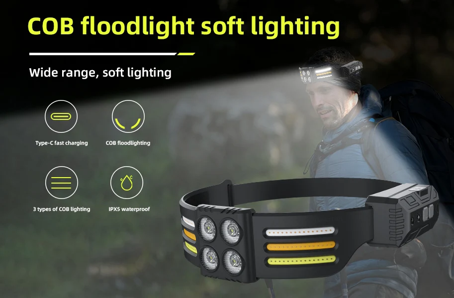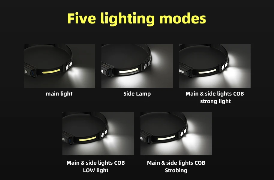 Lighting mode: main light + COB light - main light - COB white light - yellow light - red light - red light flash - SOS (press the switch for 2 seconds)