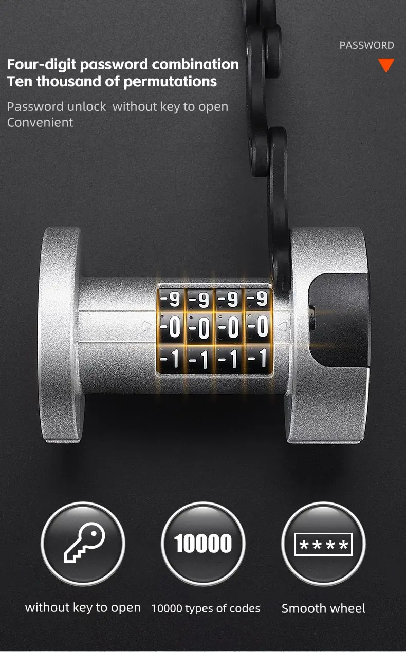 Features:Quick lock, four-digit code, durable, retrieve password with key